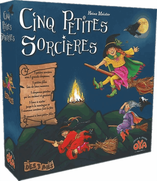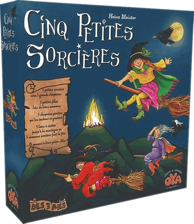 Avec Cinq Petites Sorcières, les enfants plongent dans un univers féérique où cinq petites magiciennes, cachées sous leurs chapeaux pointus, s’élancent vers la montagne pour rejoindre leur maman. Chaque joueur lance le dé, puis soulève un chapeau pour tenter de retrouver la sorcière correspondant à la couleur indiquée. Si la bonne sorcière est découverte, elle avance sur le chemin. Sinon, le tour passe au joueur suivant. Certaines faces spéciales, comme la « Double Flèche », viennent pimenter la partie en permettant d’échanger les positions ou de faire progresser plus vite certaines sorcières. Le premier à amener une sorcière au sommet de la montagne remporte la partie ! Avec ses règles simples et ses parties rapides (environ 15 minutes), Cinq Petites Sorcières encourage la concentration, la mémoire visuelle et la coordination motrice. Le matériel, composé de grands chapeaux à manipuler et d’un plateau coloré, suscite immédiatement la curiosité des enfants et stimule leur imagination.
