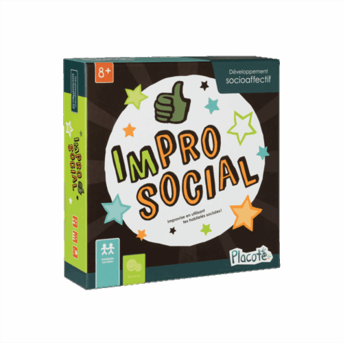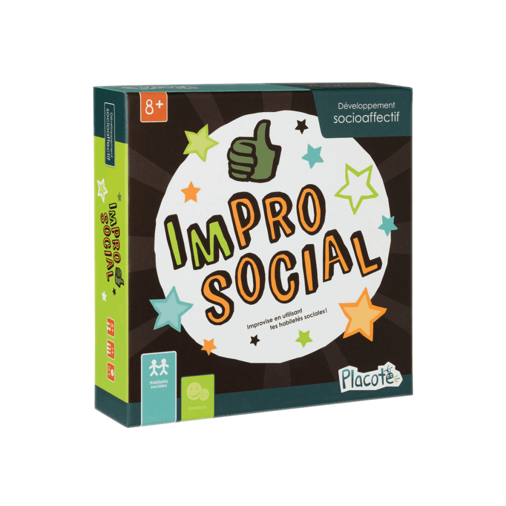 Tu viens de recevoir en cadeau un chandail que tu trouves laid. Ton voisin de classe tente de copier sur toi pendant un examen. Tu as brisé un livre qu’un ami t’a prêté. Que fais-tu dans ces situations? N’oublie pas d’utiliser tes talents d’acteur! ImProsocial est conçu pour aider les jeunes de 8 à 14 ans à réfléchir aux différents comportements qu’ils peuvent adopter dans des situations qui mettent leurs habiletés sociales au défi. La roulette qui les invite à faire une improvisation de manière émotive, neutre, enfantine ou prosociale les aide à pousser leur réflexion.