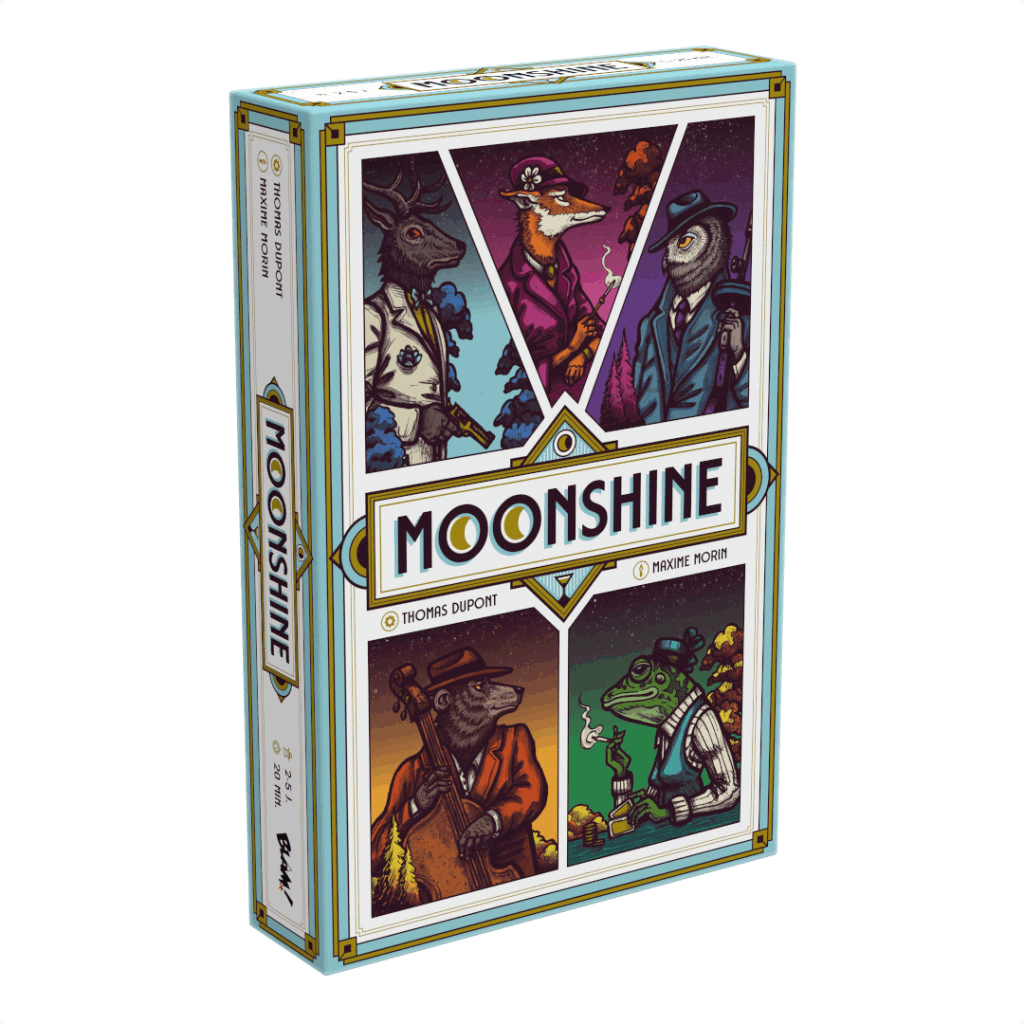 Moonshine est un jeu de construction de moteur avec des dés dans lequel les joueurs jouent en simultané. A chaque tour de jeu, chacun exploite pour son propre compte le résultat des dés obtenu par le joueur actif, afin de renforcer l'attrait de son bar clandestin.